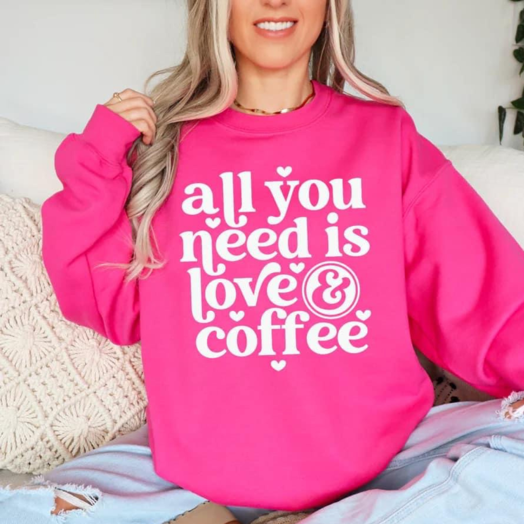 Stay cozy and stylish with our "All You Need Is Love & Coffee" shirt. Made with a 50/50 cotton polyester blend, it is soft and comfortable and classic fit. Perfect for coffee lovers, this sweater showcases the best of both worlds.