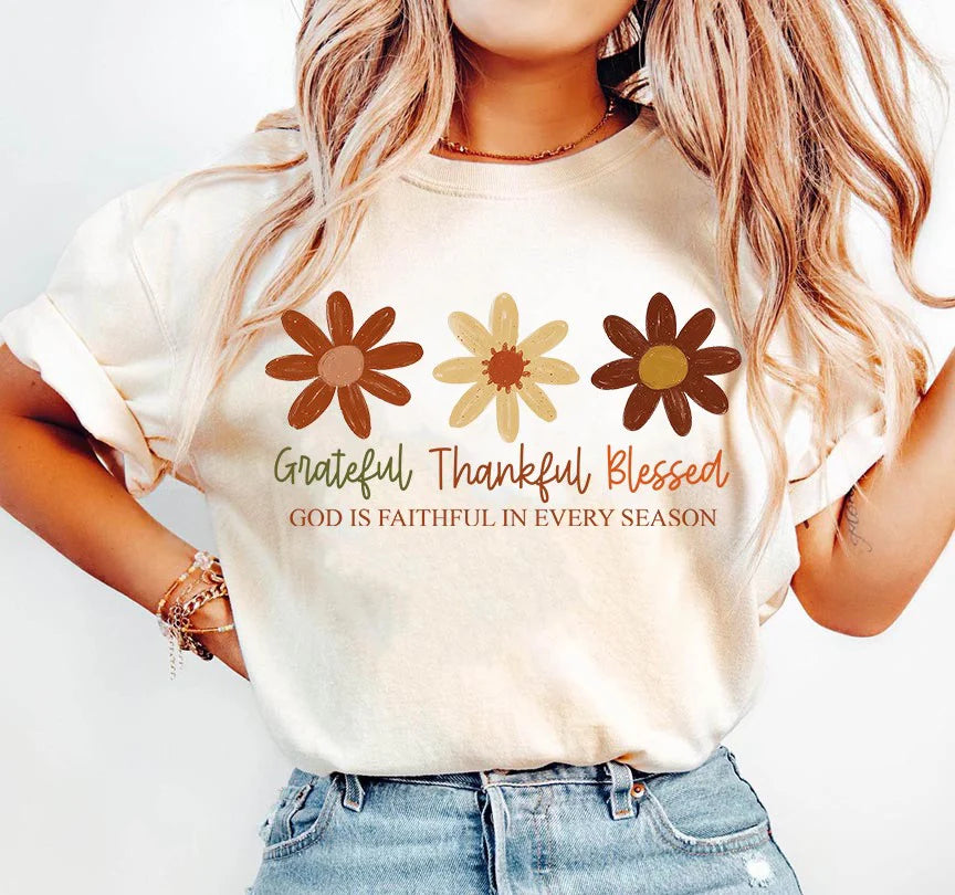 Grateful, Thankful, Blessed – a cheerful reminder to celebrate life's good moments! This design brings together three powerful sentiments in a fun, uplifting way that's perfect for anyone who loves spreading positivity.